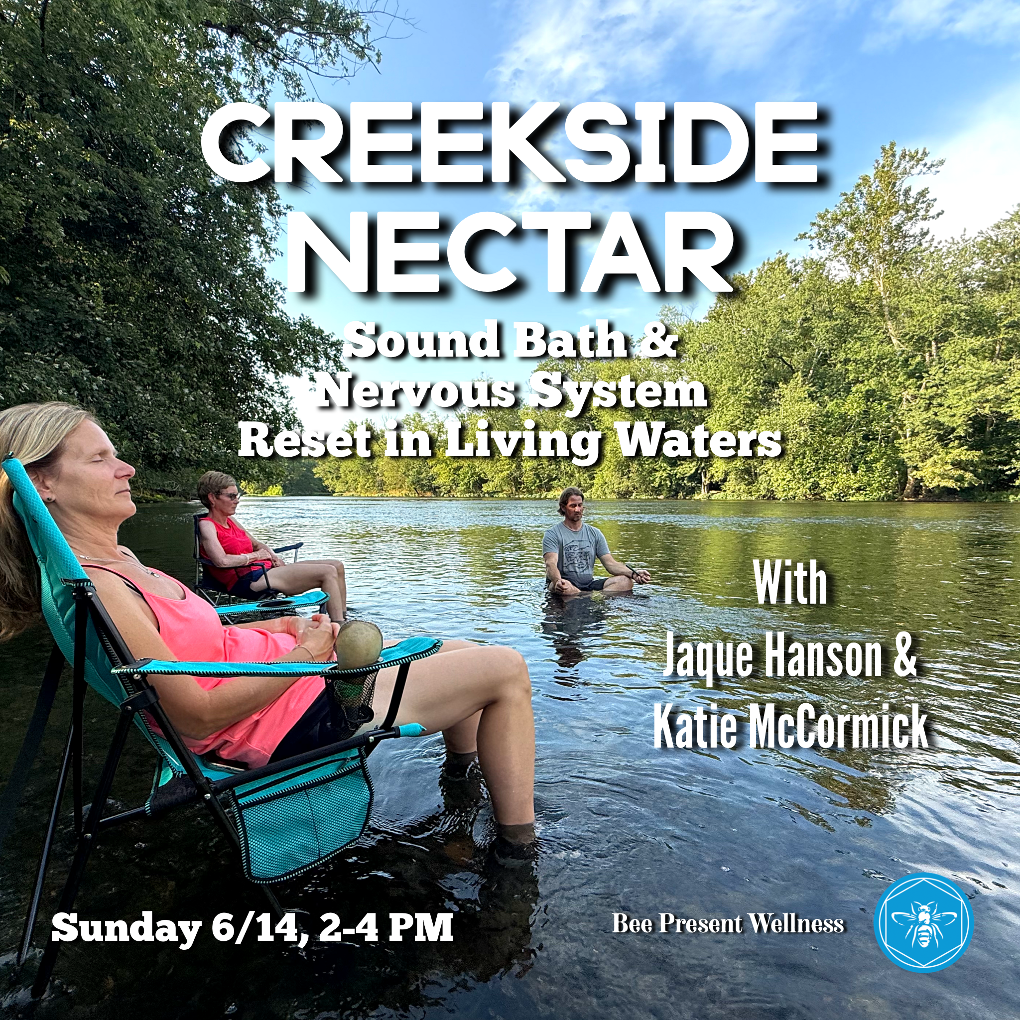After setting a personal intention for your creek retreat, you’ll recline in your folding chair and drift into deep rest. A soft breeze may caress your hair, your face, and your body as guided breathwork and visualization gently lead you into a felt sense of oneness with Mother Earth and all of her gifts.